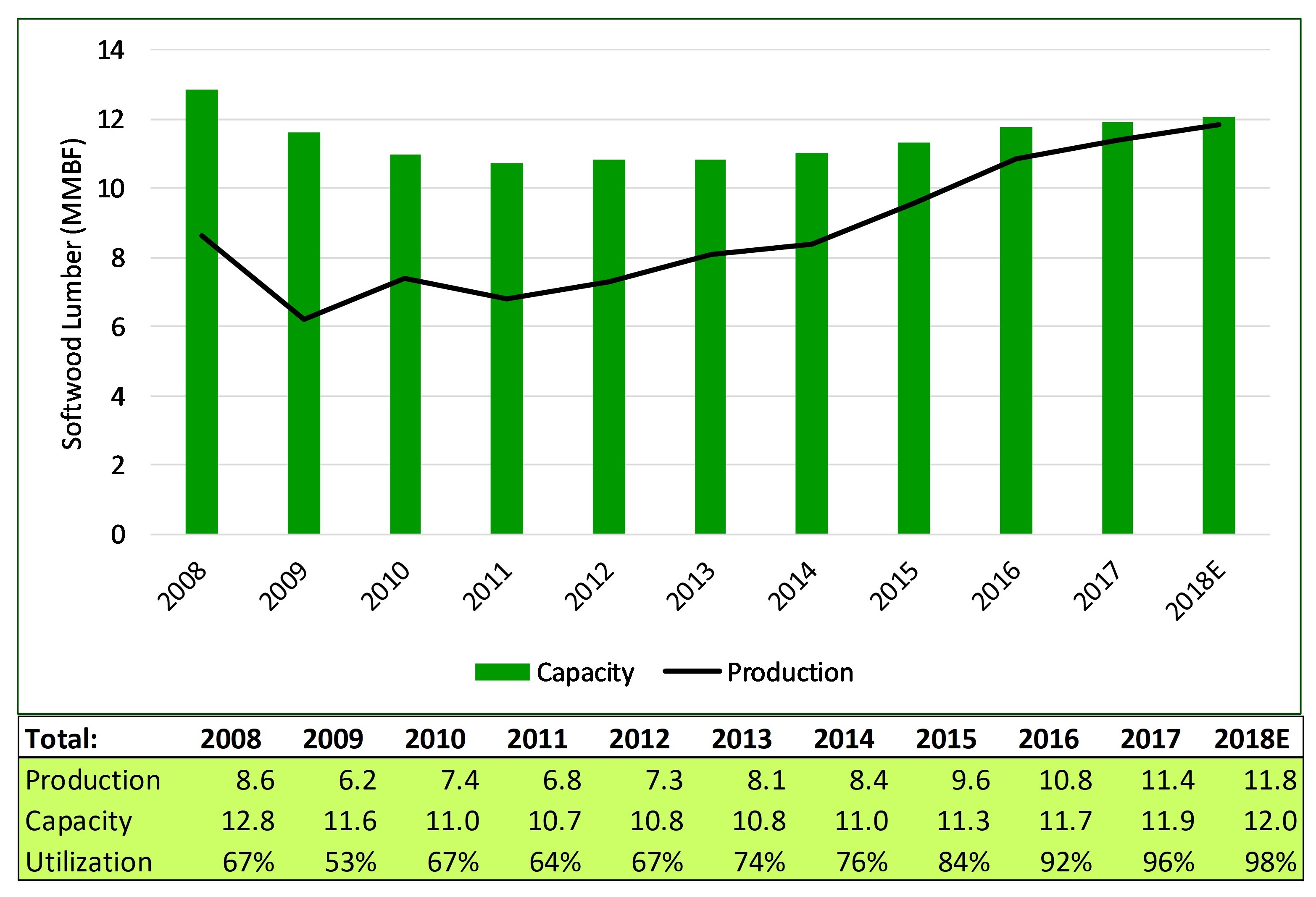 Over the past decade, Eastern Canada has consistently been the fourth-largest installed base of regional softwood lumber manufacturing capacity in North America, behind the U.S. South, the U.S. West, and Western Canada. However, the region has gained importance as a source of incremental production and capital investment, offsetting lost production in the wake of the mountain pine beetle infestation and devastating fires suffered in Western Canada. Eastern Canada currently accounts for 12.0 billion board feet (BBFT) of softwood lumber capacity (17% of North America’s total capacity), a modest reduction from a decade ago. However, production is on track to reach 11.8 BBFT this year – the seventh consecutive year of production gains (Figure 1). With a utilization rate of 98%, Eastern Canada lumber producers are making the most of their assets.