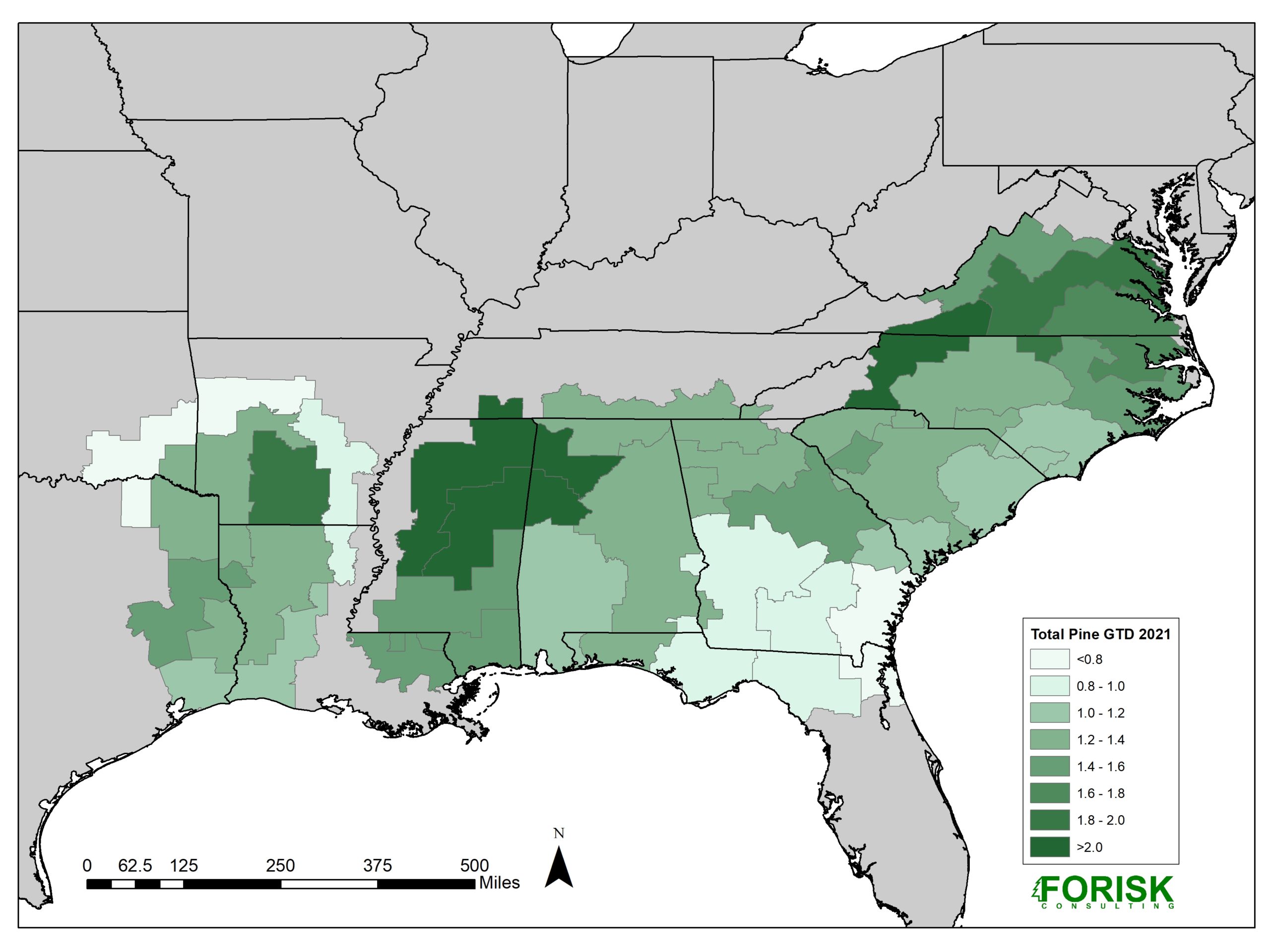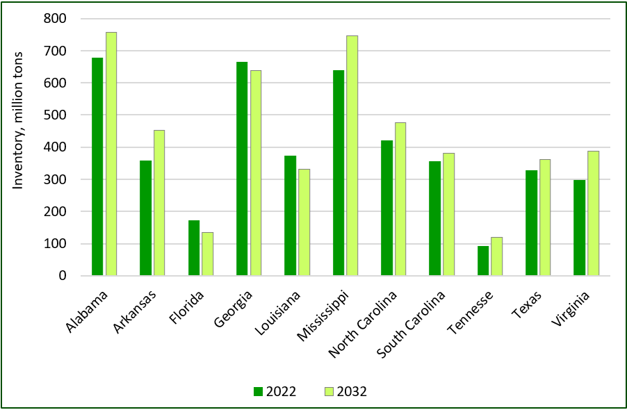 Updated models forecast the pine inventory in the South to increase 9% in the next ten years. Supply forecasts project more inventory growth than our models last year due to higher inventories and timber growth/acre as measured by the U.S. Forest Service and lower expectations of demand from a lower housing outlook. Results vary by state. Pine inventories decline in Florida, Georgia, and Louisiana. Inventories increase in the other Southern states, with the largest inventory increases by volume in Mississippi, Arkansas, Virginia, and Alabama. Results also vary by product: pine sawtimber inventories increase 17% in the South in ten years, while pulpwood declines 3%.