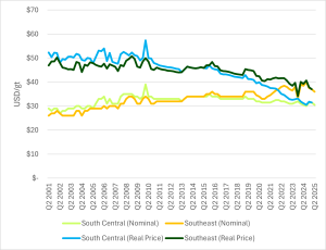 Adjusted using the Q1 2025 Consumer Price Index (PCI), Q2 2001 prices would be approximately $52.00 per green ton (gt) in today’s dollars in the South Central region and $47.00/gt in the Southeast. This represents a real value decline of $21.00/gt and $10.00/gt, respectively, compared to the nominal price increases. While comparing chip price growth to consumer price inflation may not capture its growth over other industrial feedstocks or the cost of wood processing, it highlights the change in chip value relative to the U.S. dollar over time.