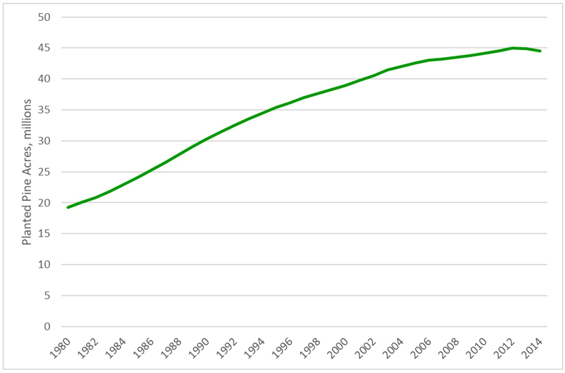Despite the recovery in tree planting since 2010, the total number of planted pine acres in the South has stagnated. In 1980, the South had 19.3 million acres of planted pines, according to USFS FIA data (Figure 2). By 2000, that number had more than doubled to 39.0 million. In 2012, planted pine acreage peaked at 45.0 million acres and declined slightly to 44.5 million acres by 2014. Notably, this marks the first time that total pine plantation acres have declined southwide. Historically low prices for pine stumpage over the past several years are unlikely to encourage more conversions to planted pine, but robust tree planting activity in the past several years suggest that planted pine acres are likely to remain near all-time highs for the foreseeable future.