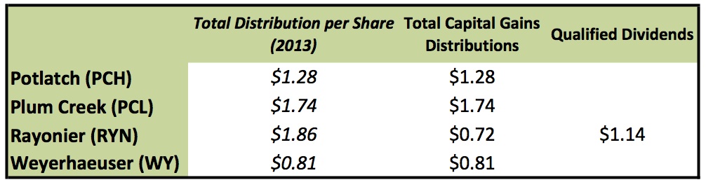 For Plum Creek, Potlatch and Rayonier, 100% of dividends paid in 2013 will be treated as capital gains. For Rayonier shareholders, $1.14 (61.29%) will be treated as ordinary dividends while $0.72 (38.71%) qualify as capital gains. For further details on how timber REITs typically fund dividend distributions, please see our earlier blog on this topic.