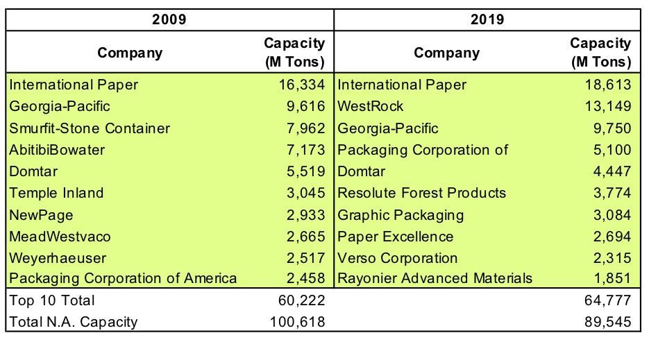 Figure B. Top Ten North American Pulp Producers, 2009-2019