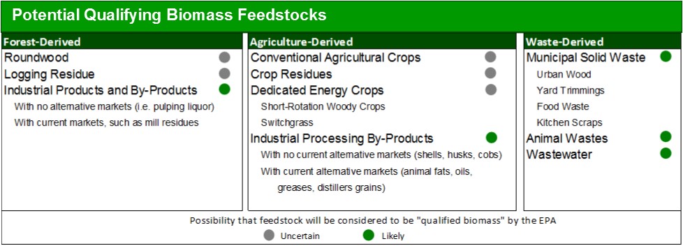 Large-scale increases in wood biomass use to satisfy the CPP are unlikely; wood will be part of the solution for some states, and will likely be residual or urban waste material. Biomass could play a role in state plans to satisfy the CPP, but uncertainty exists for which biomass feedstocks the EPA would allow (termed “qualified biomass”). While other renewable energy sources, such as wind and solar, do not emit carbon dioxide during electricity production, biomass-based generation can emit carbon dioxide. This fact complicates its use as an option to reduce carbon dioxide emissions, and heightens the importance of carbon accounting methodologies for this electricity source. The EPA will approve biomass sources in state plans that have a satisfactory proposed monitoring and auditing process. This leaves it to the states to identify biomass sources in their plans, propose carbon accounting methodology, and detail processes to monitor and track carbon and sustainability. The CPP does hint that some industrial products and waste-derived sources of biomass would likely qualify.