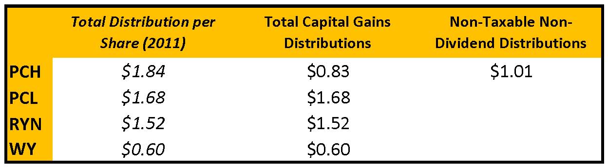 For Plum Creek (PCL), Rayonier (RYN) and Weyerhaeuser (WY), 100% of the dividends paid in 2011 will be treated as capital gains. For Potlatch (PCH) investors, $1.01188 per share (54.955878% of the total distribution) will be treated as return of capital, while the balance will be treated as capital gains.