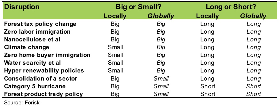 The previous post referenced the limitation of simply asking our two screening questions (“Big or small? Long or short?”) when evaluating potential disruptions. Some events affect businesses or investments locally, but not the entire industry or market and vice versa. Big changes can affect us locally, globally, or both. As we have long taught and written, timber markets are uniquely local. For strategy development, we want to specify the context of the disruption to best understand its absolute and relative risks, whether positive or negative.
