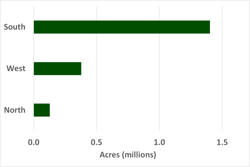 In addition to deals already completed, several large holdings currently listed or announced should boost transaction volumes in the South. PotlatchDeltic and Catchmark are combining to form an integrated timber REIT. The deal includes Catchmark’s 350,000 acres of timberlands in Alabama, South Carolina, and Georgia. Also, Manulife is offering their Project Dionysus timberlands, a collection of over 163,000 acres across Texas, Alabama, and Georgia. These two deals would add another half million acres to the South, potentially raising 2022 volumes to more than 2.4 million acres.
