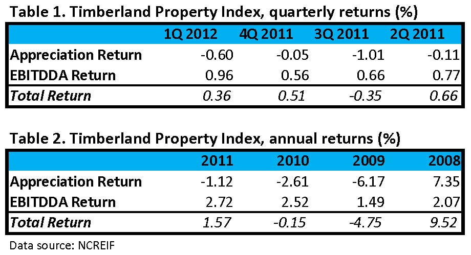 Recent returns from the NCREIF Timberland Index affirm that turmoil reigns in timber. For four consecutive quarters, NCREIF has reported negative appreciation returns for private US timberlands (Table 1). And for three consecutive years, NCREIF reported negative appreciation returns for private US timberlands (Table 2). Meanwhile, these timberlands continue to generate on the order of 1.5 – 2.5% annual cash returns.