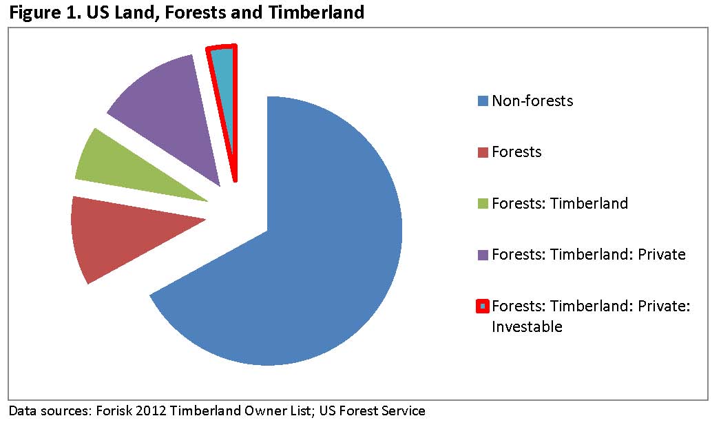 How can timberland be in short supply for investors? In a country of 2.2 billion acres, the US boasts over 745 million acres of forests. This includes 504 million timberland acres, of which 48% is privately owned. However, the reality remains that industrial forest production and institutional investment occurs on a small slice of real estate, accounting for about 75 million acres, or 3.3% of the US land base (Figure 1). Most of these acres are owned and managed by a few dozen entities. In short, the US timberland market comprises (relatively) constrained acreages and (relatively) few scalable participants.