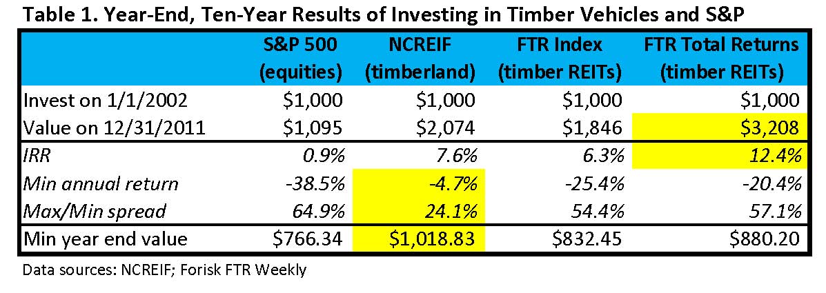 The results emphasize important realities and reminders for investors.  First, timber vehicles outperformed the S&P over the 10-year holding period across all metrics.  Second, liquidity unnecessarily burdens open-eyed long horizon timberland investors.  While private timberlands do not offer the “upside” available to liquid equities, they do provide sturdier protection.  Not once in the example did private timberland investors fall into the red.  Third, public timber REITs demonstrate total internal rates of return (IRR including dividends) exceeding 12% with less volatility than the S&P 500.  While the S&P investment ends below $1,000 in four years (2002, 2003, 2008 and 2009), the Forisk Timber REIT (FTR) investment ends below $1,000 just once (2002).