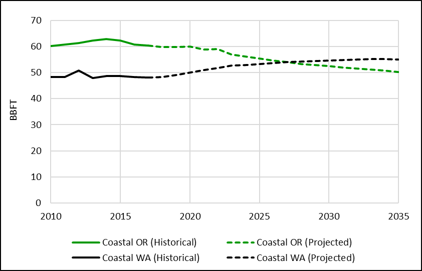 Through 2033, commercial softwood sawlog inventory is expected to fall in coastal Oregon but rise in coastal Washington. Across the entire coastal PNW region, commercial sawlog inventory is expected to fall by 2.5%, from 109.2 BBFT in 2024 to 106.4 BBFT in 2033. Oregon sawlog inventory falls below Washington by 2027, reaching 51.3 BBFT by 2033 (about 20 times annual removal volume). Inventory in Washington is projected to increase to 56.2 BBFT by 2033 (about 34 times annual removal volume).