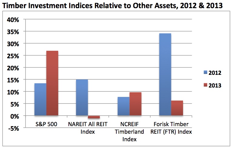 So let’s take a look and compare, for 2012 and 2013, the performance of indices tracking the S&P 500, all publicly-traded real estate investment trusts (NAREIT), private timberlands (NCREIF) and publicly-traded timberland-owning REITs (FTR). The timber REITs in the FTR Index include Plum Creek (PCL), Potlatch (PCH), Rayonier (RYN) and Weyerhaeuser (WY).