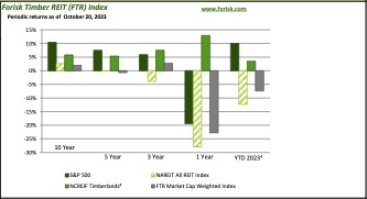 Year-to-date 2023, as of the week ending Friday October 20th, the FTR Index returned -7.43% versus 10.02% for the S&P 500. Currently, publicly traded timber REITs account for about 2.6% of the total market cap for all public REITs.