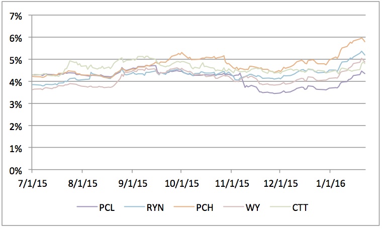 Timber REIT Dividend Yields, 7/1/15-1/22/16