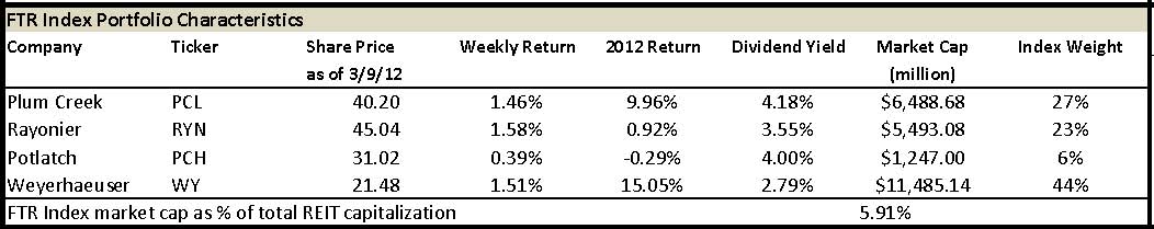 Just over two months into 2012, the public timber REIT sector pulled ahead of the S&P 500. According to the Forisk Timber REIT (FTR) Index, timberland owning REITs returned 9.84% YTD relative to 9.01% for the S&P 500. Weyerhaeuser (WY) and Plum Creek (PCL) led the sector’s surge, with 15% and 10% ten-week price appreciations respectively since the New Year (see table).