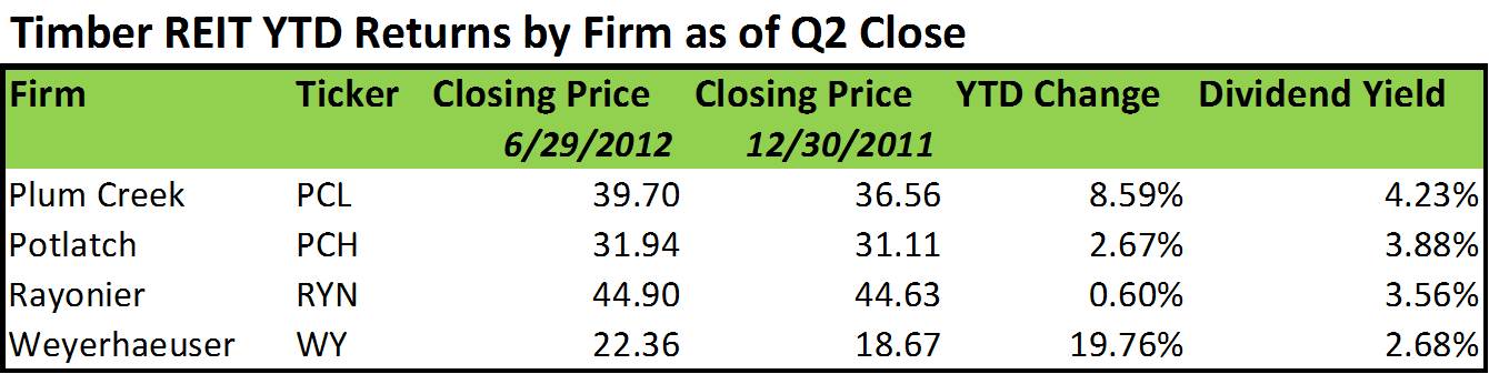 As we hit midfield for 2012 and closed out the second quarter, the timber REIT sector as measured by the Forisk Timber REIT (FTR) Index posted a 12.09% gain relative to 8.31% for the S&P 500 (click here for the free FTR Weekly Summary). While the year-to-date results vary by firm (see table), the sector benefited from (1) strong exposure to improving markets for homes and construction in key US regions and (2) attractive dividend yields relative to other industries and REIT subsectors.