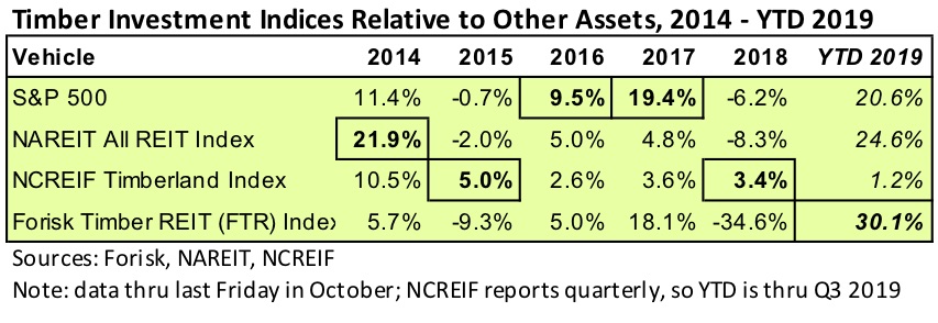 The table above compares 2014 through 2018 annual and YTD 2019 performance of indices tracking the S&P 500, all publicly traded real estate investment trusts (NAREIT), private timberlands (NCREIF), and public timber REITs (FTR). The timber REITs in the FTR Index include CatchMark Timber Trust (CTT), PotlatchDeltic (PCH), Rayonier (RYN), and Weyerhaeuser (WY).