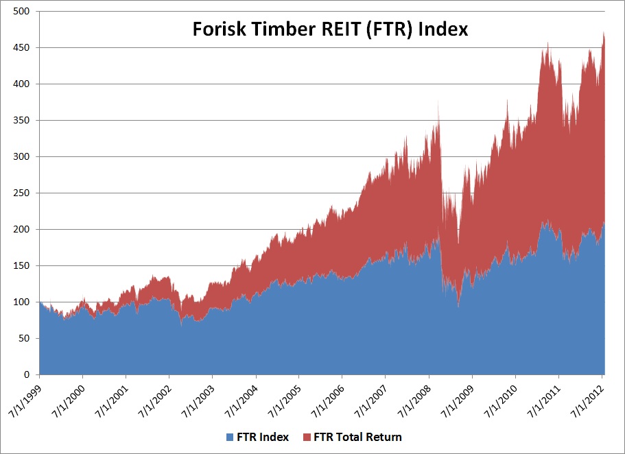 Last week, NCREIF announced year-to-date (through Q2 2012) total returns for private US timberlands of 0.97%. This total return number includes 1.54% from income and -0.57% from appreciation. Alternately, publicly-traded timber REITs, as measured by the Forisk Timber REIT (FTR) Index, generated year-to-date total returns (through July 27, 2012) of 19.93%. As of July 27, 2012, the four timber REITs provided the following dividend yields: