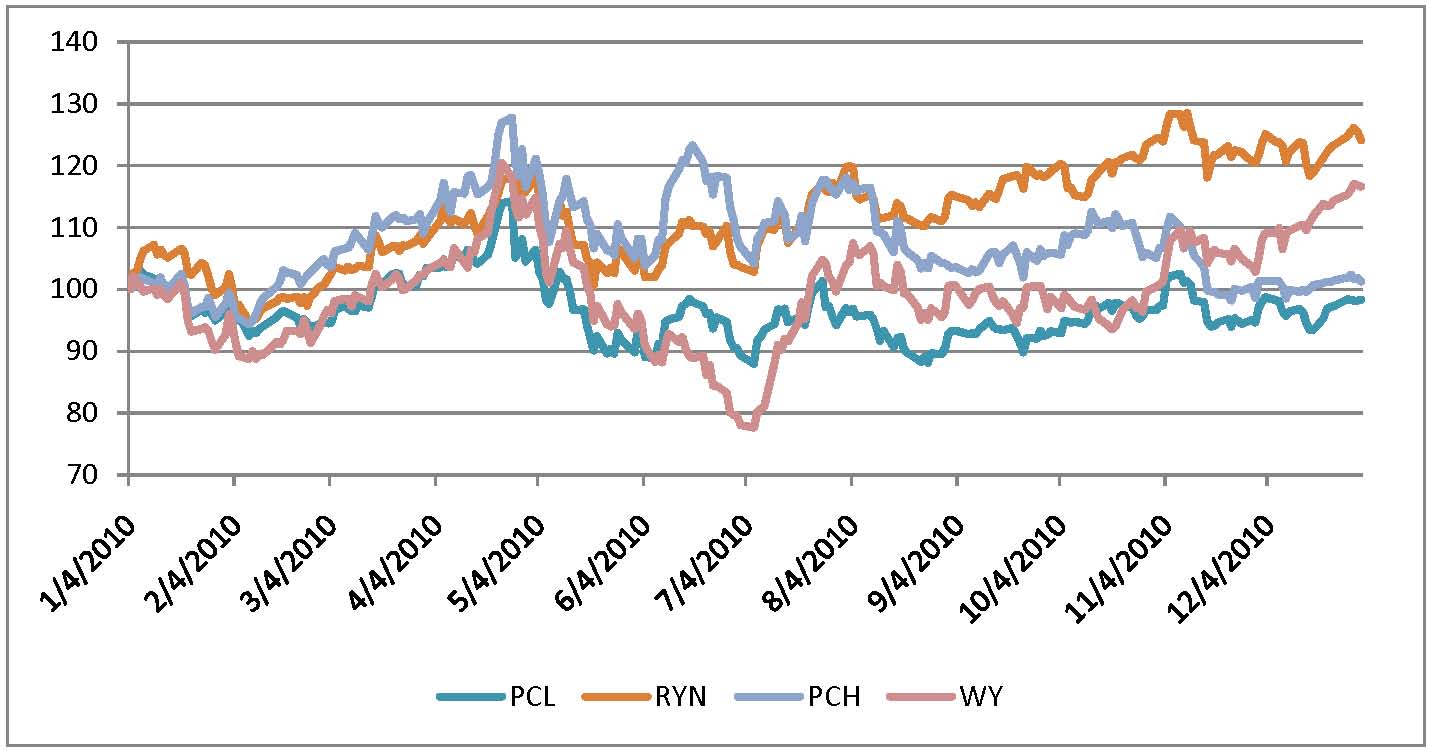 The chart below shows the comparative performance of the three publicly traded timber REITs: Plum Creek (PCL), Rayonier (RYN), Potlatch (PCH); and Weyerhaeuser, which had effectively become a timber REIT and has been added to the FTR Index effective January 3, 2011.