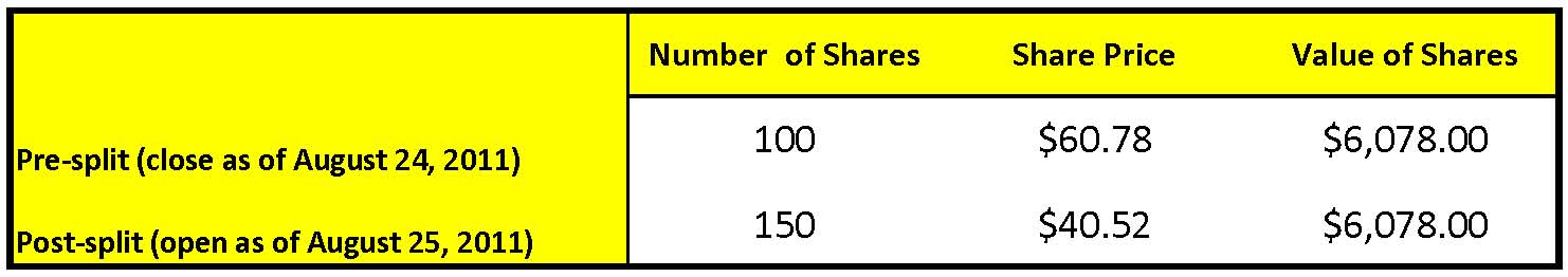 On July 25, 2011, Rayonier (RYN) announced that its board of directors approved a three-for-two stock split. On August 24, 2011, the company issued one-half additional share for each share held to shareholders of record as of August 10, 2011. As a result, RYN’s share price adjusted from $60.78 on close of August 24, 2011 to $40.52 on open of August 25, 2011 to reflect this split.