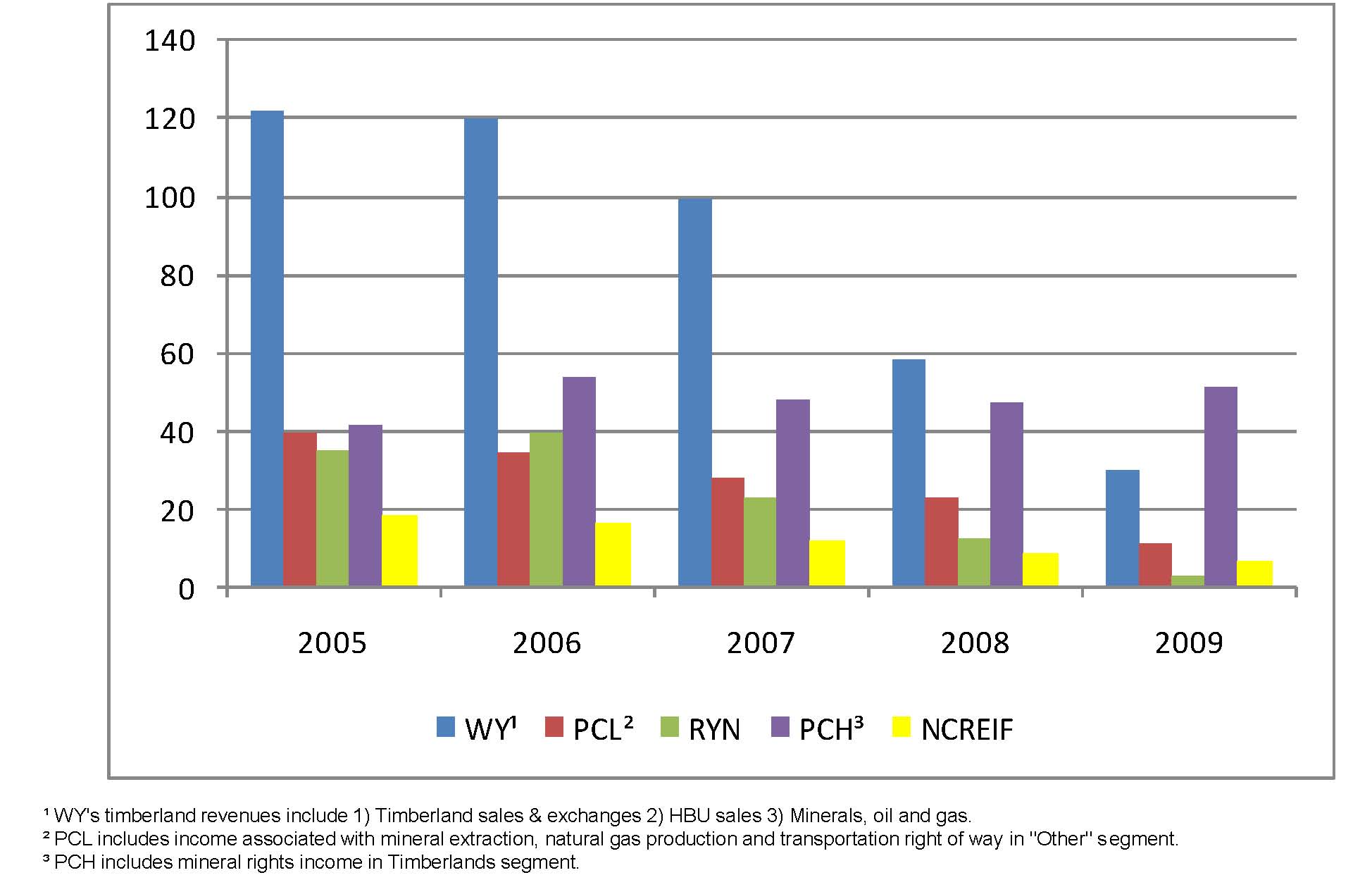 Looking back, the per-acre operating income generated from the timber REITs, WY (still a C-corporation) and private timberlands (as reported by NCREIF) varied based on tax structure, financial reporting differences, geographic locations of the timberlands, alternate access to end markets, and forest types (see figure below).