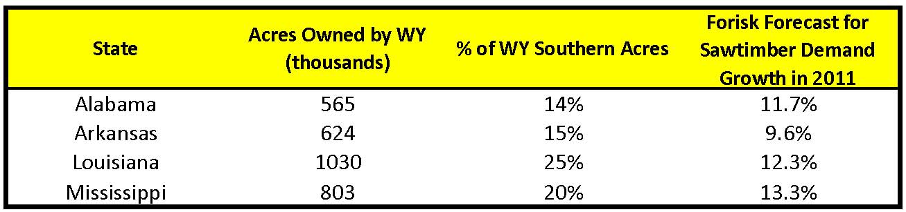 According to our models, the top five states in the US South in terms of demand growth for 2011 are Mississippi, Louisiana, Alabama, Tennessee and Arkansas. Approximately three million acres, or 74% of WY’s southern timberlands, are located in four out of five of these high growth markets. Since these markets are expected to outperform the other Southern states with respect to demand growth, this positions WY’s timber business to outperform the South-wide average assuming any strengthening in housing and lumber markets.