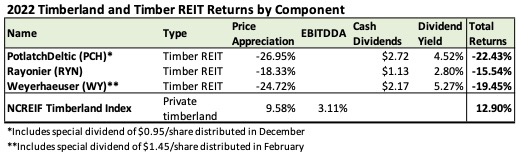 The price appreciation for the timber REITs assumes investors bought shares on December 31, 2021 and sold them on December 30, 2022 (the last trading day of the year). The dividend yields are based on the share price upon acquisition. This year featured two special dividend distributions. In January, Weyerhaeuser declared a supplemental dividend of $1.45 per share, which was distributed in February. In December, PotlatchDeltic declared a special dividend of $0.95 per share, which was distributed later that month.