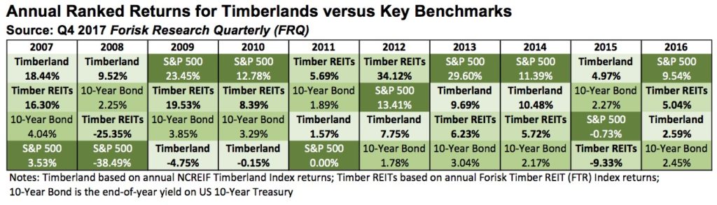 A 2017 upswing in timberland transactions, and the increasing volume of due diligence activities, also provides an opportunity to revisit the math of the sector. When we ask whether timberland is poised for resurgence or a Rocky-like comeback, we must look to its relative performance versus other asset classes. The year-by-year performance of timberland and other assets speaks to its durability as part of portfolio resilience. Timberland, like other assets, move up and down over time, depending on everything else going on in the world.