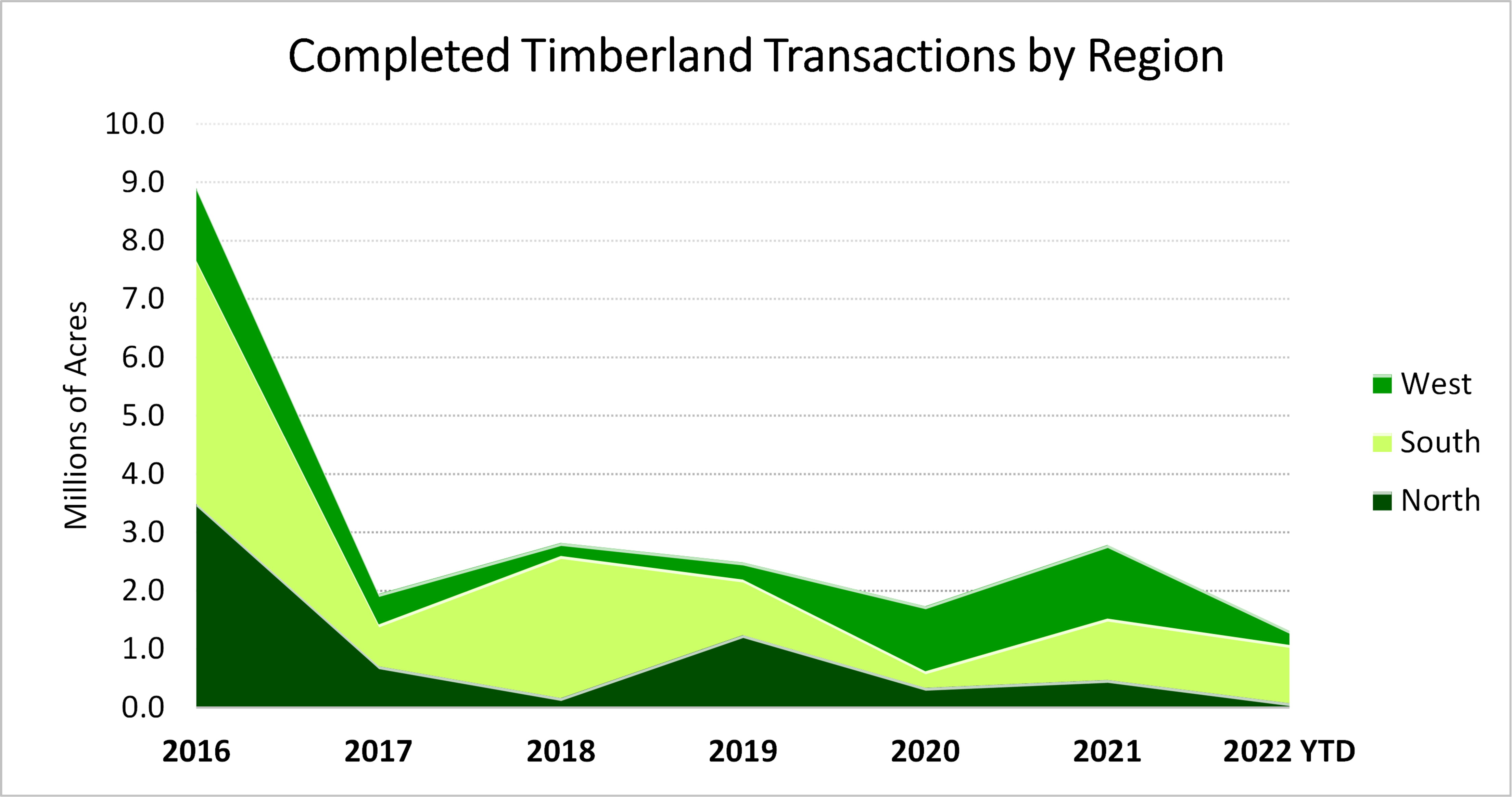 Several large holdings currently listed or announced should boost transaction volumes in H2 2022. One prominent deal is the recent announcement where PotlatchDeltic and Catchmark are combining to form an integrated timber REIT. The deal includes Catchmark’s 350,000 acres of timberlands in Alabama, South Carolina, and Georgia, set to close in H2 2022. Under the terms of the agreement, Catchmark shareholders will receive 0.23 common shares of PotlatchDeltic stock for each share they hold. Upon closing, the newly formed company will hold approximately 2.2 million acres across the Southeast and Western U.S.[5] Other notable listings include Manulife’s Ceres and Triptych offerings. Ceres consists of 238,000 acres in Texas and Western Louisiana; Triptych timberlands comprises 86,000 acres in Oklahoma, Texas, and Mississippi. Cumulatively, this would potentially add roughly 675,000 acres of timberland transactions, all in the South.