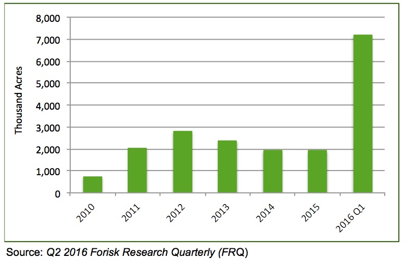 Timberland Transaction Volume in Acres by Year, 2010-Q1 2016
