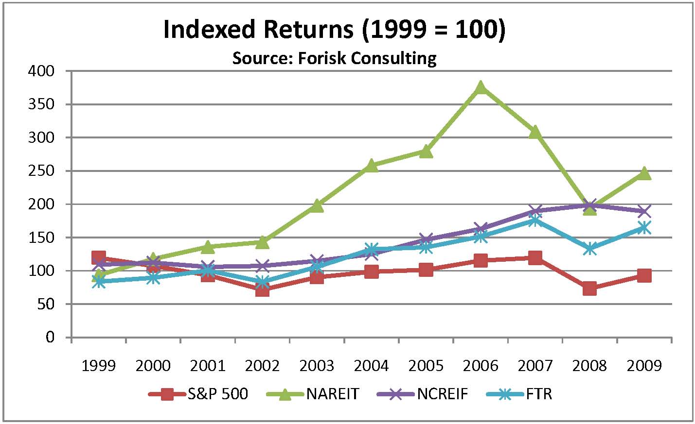 Figure 2 summarizes indexed annual returns since 1999. Even at the annualized level, returns demonstrate the extreme difference in volatility across asset classes as public REITs (NAREIT) climbed through 2006, crashed through 2008, and continue to recover in 2010 (Figure 1). Interestingly for timberland investors, private and public timber-related assets have converged over this particular 11-year time frame.