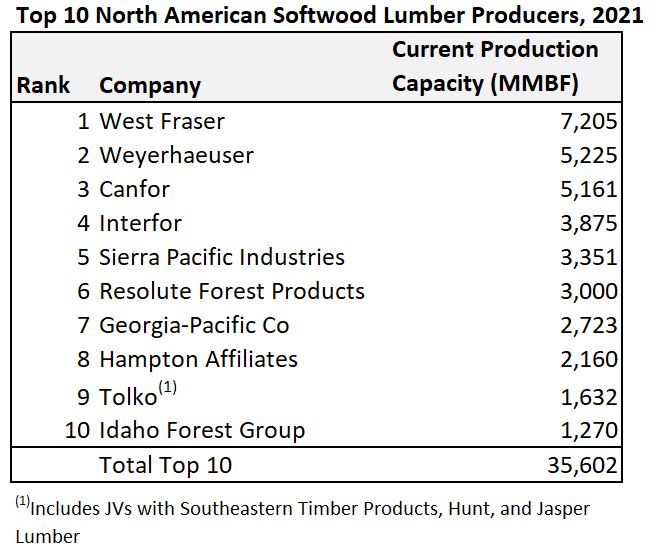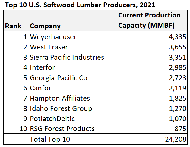 The top 10 softwood lumber producers in the U.S. have the capacity to produce 24.2 billion board feet of lumber, which represents 53% of the total U.S. industry. Weyerhaeuser tops the list at 4.3 billion board feet of capacity, followed by West Fraser at 3.7 billion board feet. Sierra Pacific Industries rose to the #3 spot this year and is followed by Interfor. Georgia-Pacific fell from #3 in January to #5 currently.