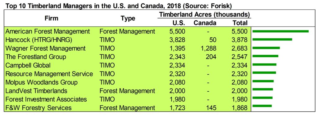 When looking separately at the top 10 timberland managers, TIMOs hold seven slots. These seven TIMOs manage 17.8 million acres, or 66% of the 27.2 million acres managed by the top 10 firms. Of these firms, the key change since 2017 is Wagner Forest Management moving up from No. 10 to No. 3, as we now include their 1.3 million acres in Nova Scotia and Ontario. Three forestry consulting and management firms, including the largest organization on this list (American Forest Management), account for the balance.