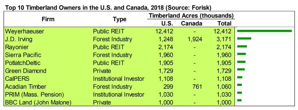 The top ten timberland owners in North America hold at least one million acres each. Our top ten list this year also accounts for freehold land in Canada for the first time. Weyerhaeuser continues to tower over its competitors with 12.4 million acres – more than the next six combined. J.D. Irving’s 1.2 million acres in Maine and 1.9 million acres in New Brunswick and Nova Scotia make it the second-largest owner on the continent. Rayonier and Sierra Pacific’s acres are little-changed from last year, while PotlatchDeltic narrowed the gap between themselves and Sierra Pacific with their merger in the first quarter. Green Diamond makes a big leap this year as well, expanding southward to become equity stakeholders and managers of the 380,000-acre Twin Creeks Timber.