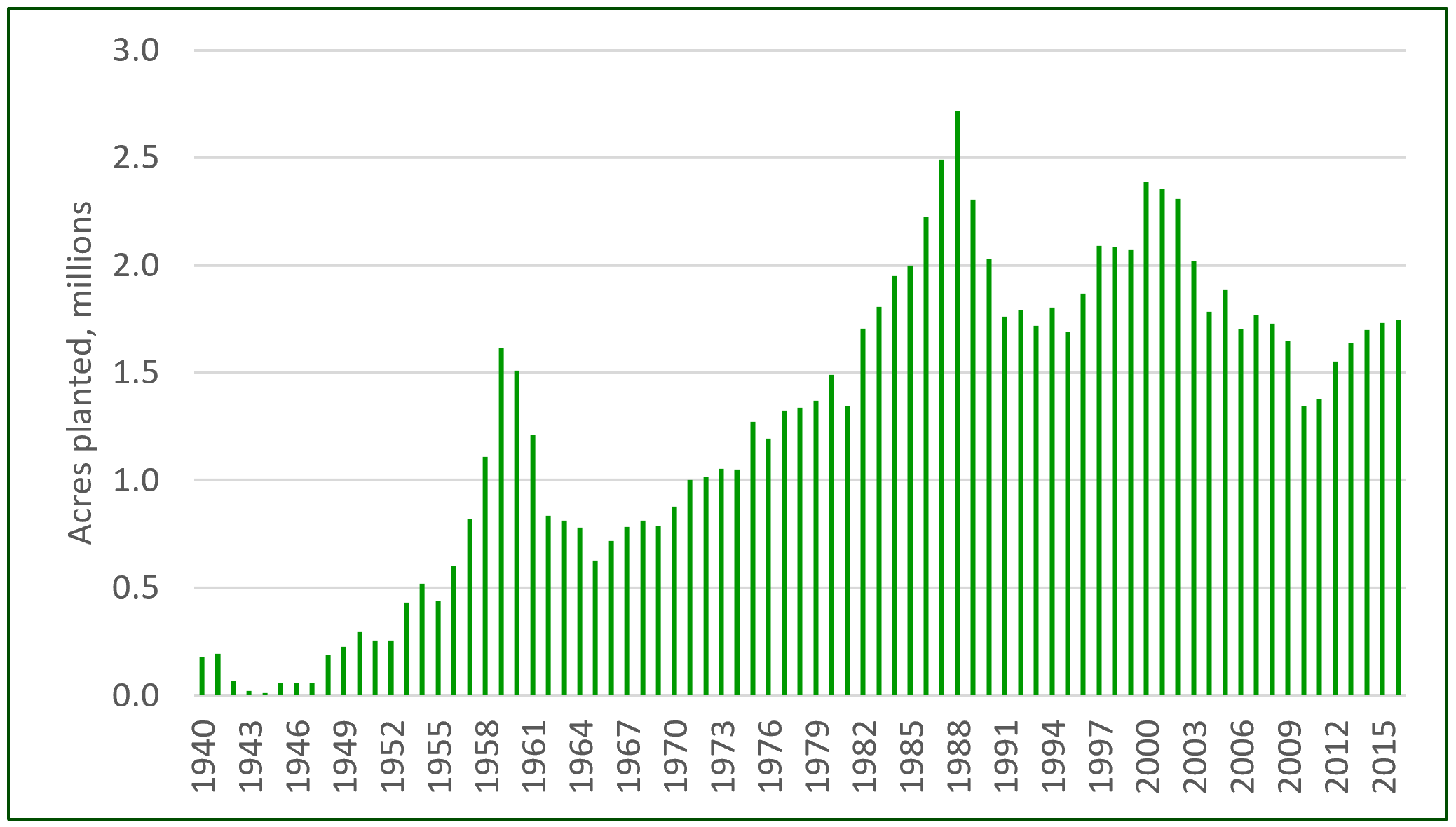 We have experience with forestry-related government incentive programs. And we already plant a lot of trees. Figure 1 below shows acres of trees planted in the U.S. South since the 1940’s. The first surge in planting activity in the 1950’s corresponds with the federally financed Soil Bank Program, which was a voluntary land retirement program for cropland. The second wave of activity in the 1980’s ties to the Conservation Reserve Program (CRP), in which the U.S. Department of Agriculture incented landowners to plant trees on former fields and agriculture lands. The effects magnified each other, as a major decrease in harvesting activity during the economic recession of 2007-2009 fed already strong forest inventories planted 30 and 60 years ago. These combined activities resulted in timber “oversupply” across the South as reflected in low and less responsive timber prices, although some local timber markets are becoming more balanced.
