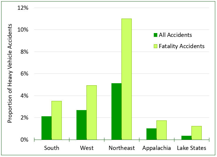 Depending on our assumptions, log trucks represent roughly 1% of vehicles regulated by the Federal Motor Carrier Safety Administration (FMCSA) in the U.S. Using back of the envelope math on the amount of wood we harvest, average haul distances, and payloads, log trucks represent 2.5-3.5 billion vehicle miles traveled per year, which is also about 1% of the U.S. total for large trucks. Averaging FMCSA crash statistics over the past five years, log trucks have been responsible for about 1% of the large truck accidents as well. So at a high level, accident rates for log trucks are roughly in line with other types of heavy trucks. However, log trucks have been responsible for 2% of large truck fatalities on average (Figure). On average, 2.5% of large truck accidents result in a fatality in the U.S. while fatalities occur in 4.5-5% of log truck accidents.