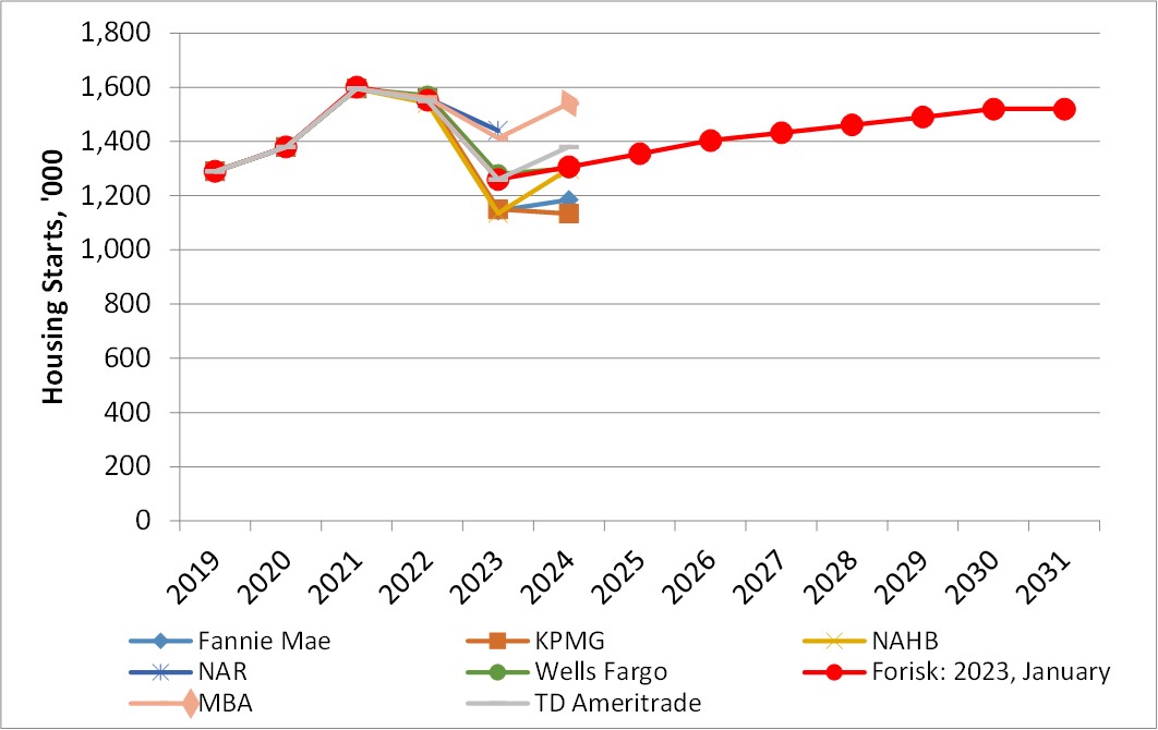 Forisk projects 2023 housing starts of 1.26 million, down 18.8% from 2022 actuals. This represents a 10.8% decline from our October 2022 estimate. High mortgage rates continue to hamper housing affordability and builder sentiment remains low. The NAHB/Wells Fargo Housing Market index, a monthly sentiment survey among builders of single-family homes, fell 57.8% year-over-year.[1] Forisk’s Base Case declines sharply in 2023 before beginning to recover. The forecast peaks at 1.52 million housing starts towards the end of the projection. Despite widespread consensus that housing starts are trending lower for 2023, estimates vary widely for 2024. For example, KPMG forecasts a bearish 2024 with an estimate of 1.134 million starts. Meanwhile, MBA posits a much more bullish 2024, rising back to 1.541 million starts. This represents a range of 407 thousand starts.
