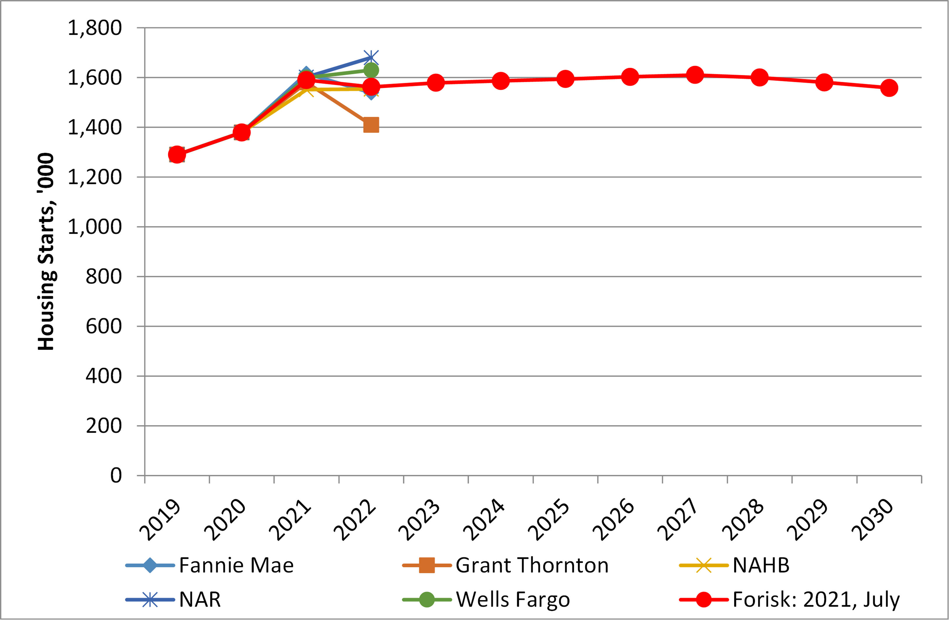 Each quarter when updating our Forisk Research Quarterly (FRQ) forecast models, we revisit prior projections and review applied research on business and economic forecasting. Forisk’s Housing Starts Outlook combines independent forecasts from professionals in the housing industry. Currently, these include Fannie Mae, the National Association of Realtors (NAR), Grant Thornton, the National Association of Home Builders (NAHB), and Wells Fargo. Forisk applies long-term assumptions from the U.S. Energy Information Administration (EIA) and Harvard’s Joint Center for Housing Studies to establish the peak and trend over the next ten years (Figure).