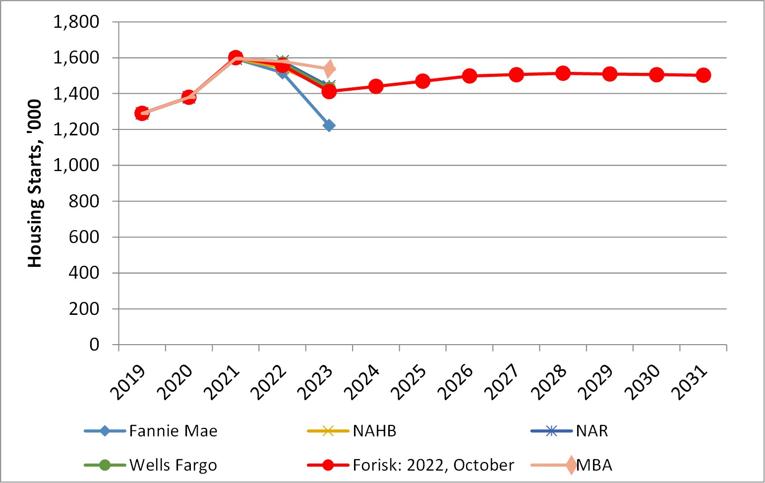 Each quarter when updating our Forisk Research Quarterly (FRQ) forecast models, we revisit prior projections and review applied research on business and economic forecasting. Forisk’s Housing Starts Outlook combines independent forecasts from professionals in the housing industry. Currently, these include Fannie Mae, the National Association of Realtors (NAR), the Mortgage Bankers Association (MBA), the National Association of Home Builders (NAHB), and Wells Fargo. Forisk applies long-term assumptions from the U.S. Energy Information Administration (EIA) and Harvard’s Joint Center for Housing Studies to establish the peak and trend over the next ten years (Figure).