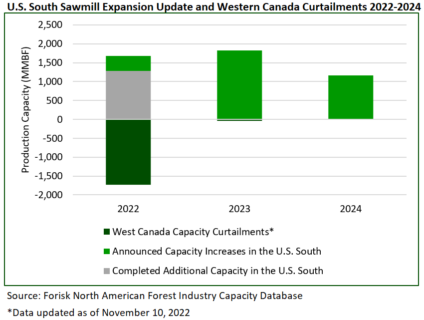 Based on data from Forisk’s North American Forest Industry Capacity Database, 1.3 BBF of sawmill capacity came on-line in 2022 via greenfield and capacity expansion projects in the U.S. South, with an additional 395 MMBF of capacity planned to begin commissioning by the end of the year. In contrast, across the continent in Western Canada, there has been at least 1.7 BBF of announced capacity curtailments in 2022, mostly motivated by increased log prices and falling lumber prices, which reduces or eliminates margins, and persistent infrastructure challenges stemming from the late 2021 floods. In 2023, Forisk anticipates an additional 1.8 BBF of Southern sawmilling capacity to come on-line, with another 1.2 BBF of capacity to be completed by the end of 2024.