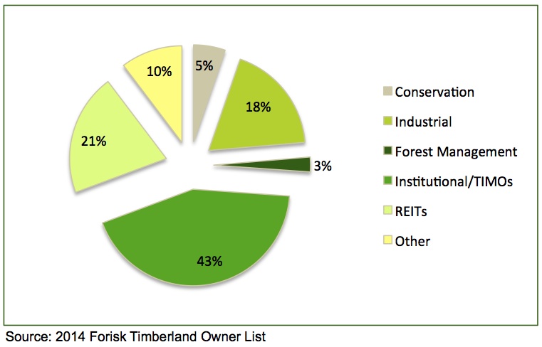 Since 2010, Forisk has tracked U.S. timberland ownership to support its forestry investment research and study of timberland investment vehicles. In 2012, we published for the first time a detailed Timberland Owner List with state-level holdings of the primary owners of private timberland in the United States. As of 2014, “industrial” and “institutional” and “investable” acres include: