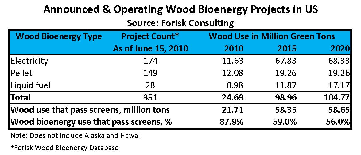 Forisk tracks and assesses all publicly-known and announced wood-using bioenergy projects in the continental US. As of June 15, 2010, this included 351 projects with potential, incremental wood demand of 104.8 million green tons by the year 2020 (see table below). Of this demand, our analysis indicates 58.7 million tons (56%) is viable. The methodology used to evaluate these projects is detailed in a recent posting and white paper published by the National Alliance of Forest Owners.