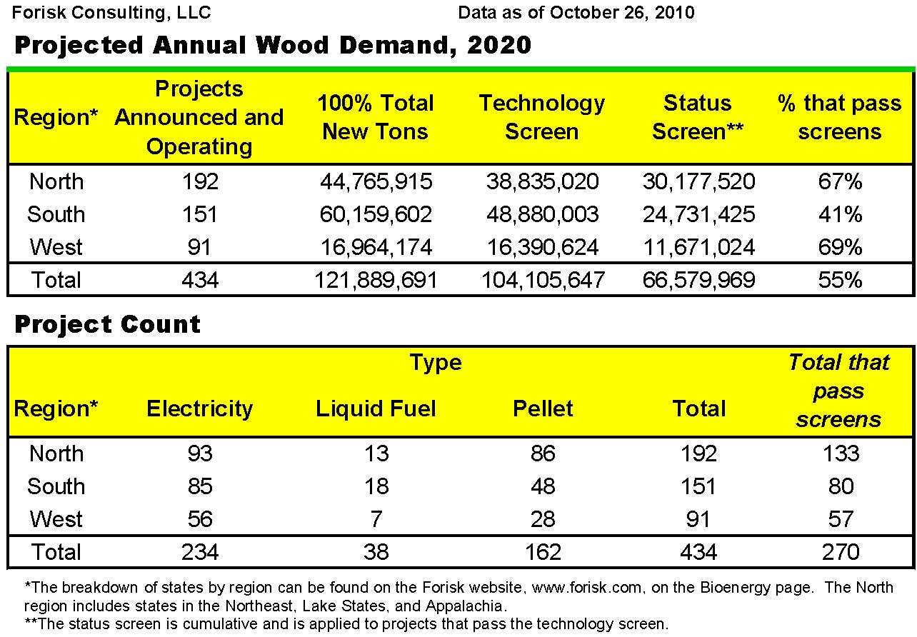According to Wood Bioenergy US, the number of announced and operating wood-consuming bioenergy projects in the continental US increased to 434 as of October 26, 2010. In total, these projects represent potential, incremental wood use of 121.9 million green tons per year by 2020. However, based on Forisk analysis of applied technologies and operational development, projects representing only 55% of this volume – 66.6 million tons per year – pass basic viability screening (see tables).
