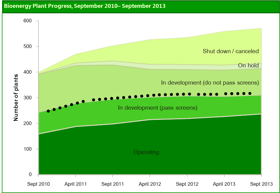 In June 2012, Forisk posted data related to the rate of and reasons for bioenergy project failures since 2010. At the time, more projects in the U.S. had been canceled or shut down than had advanced through our basic viability screening. As review of the data as of September 2013 finds, nation-wide, this trend continuing.