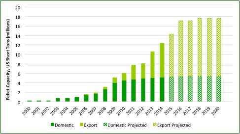 U.S. wood pellet production could grow 6.0 million tons by 2018; of this growth, 97% would be intended for export markets.