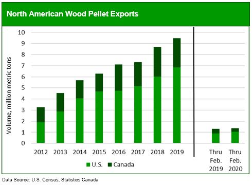 North American wood pellet exports increased 9.4% in 2019, reaching 9.5 million metric tons. Through February 2020, wood pellet exports were up 4.9% year-over-year.