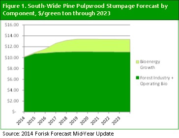 On average for the U.S. South, 71% of the increase in pine pulpwood stumpage prices is associated with increased demand from viable wood bioenergy projects (Figure 1). Pine pulpwood demand from bioenergy is projected to increase by 302% in the U.S. South by 2023 while average pine pulpwood prices are projected to increase 32%. At the state-level across 11 states pine pulpwood stumpage prices are projected to increase anywhere from 1% to 100%.
