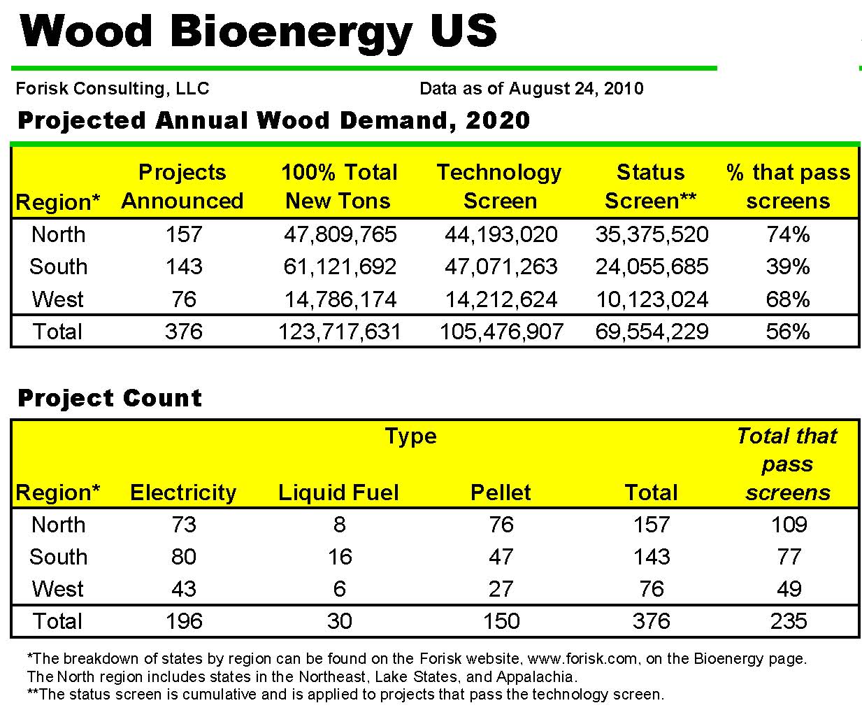 According to Wood Bioenergy US, wood pellet and wood-to-electricity plants in the continental US will consume over 30 million green tons in 2010. This is based on screening the 376 wood-consuming, announced and operating bioenergy projects in the Wood Bioenergy US database as of August 24th, 2010.