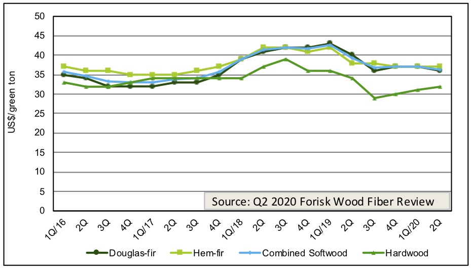 Eastern Canada fiber prices, as in Q1 2020, experienced substantial turmoil in Q2 2020. Softwood residual chips in Eastern Ontario/Quebec decreased 6% and roundwood fell even more. All products, including fiber prices in the Maritimes, declined for the quarter and year-over-year. Western Canada also showed price declines across products, with softwood roundwood down for the quarter (while up 4% year-over-year). In Alberta and BC, softwood chips declined 4 to 5% for the quarter.