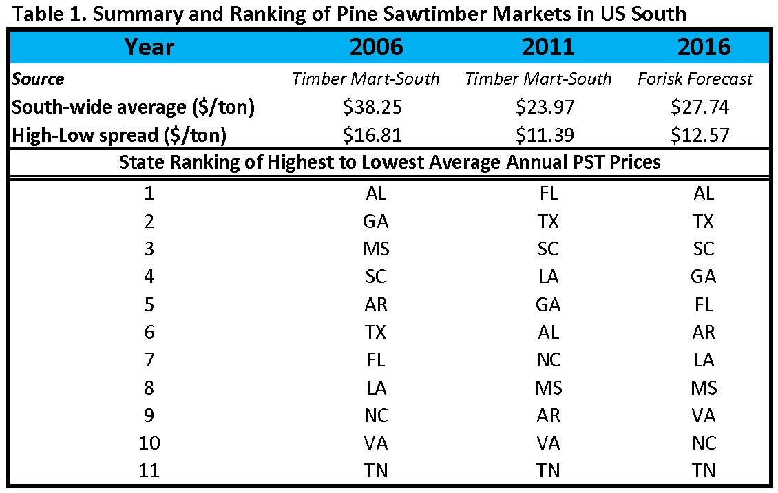 Consider the disparity of historic and forecasted pine sawtimber prices across markets in the US South over time (Table 1). The wide ranges of prices (High-Low spread) across states in the past translate into broad ranges of estimated prices across states in the future. We have used stumpage price data from dozens of public and private sources, and all have limits. When applying third-party stumpage price data, we want to know, for example, (1) how well the price series reflects realized changes over time and (2) how well the series reflects price levels over time. These are two different questions that speak to the coverage, consistency and biases imbedded in the data.