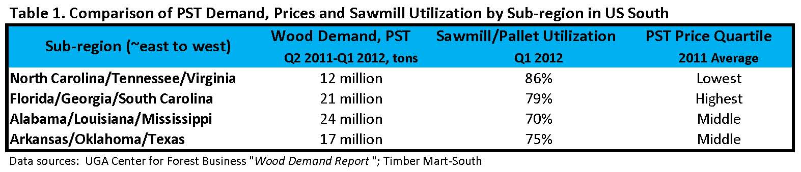 Consider the question of wood demand. As a timberland investor, would you prioritize high volume markets (with lots of mills demanding lots of wood) or high utilization (where mills run at near capacity)? As a wood user looking to locate a new facility, which would you prioritize? Table 1 provides a snapshot of the disparity of wood demand for pine sawtimber (PST), utilization at PST-using mills and PST pricing across groups of states in the US South. [Please note: “utilization” as reported by the Wood Demand Report captures the ratio of actual raw material purchases in a quarter to the potential wood demand at full capacity. The ratio varies over time in part due to changes in mill inventories.]
